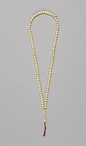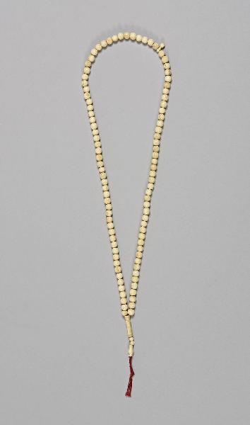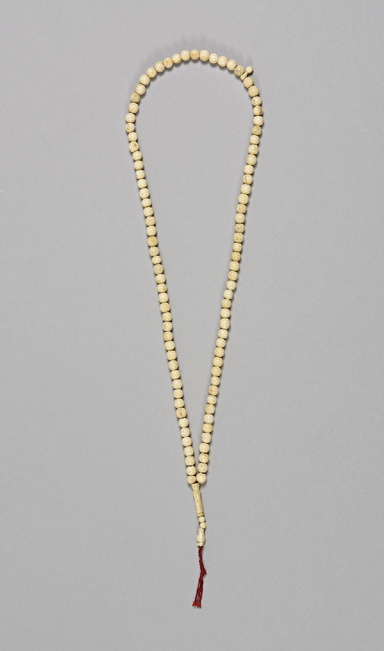 Collana (tasbih) in osso composta da perline sferiche (diam. 0,7) con due elementi ovoidali allungati. La chiusura termina con un elemento cilindrico decorato.
