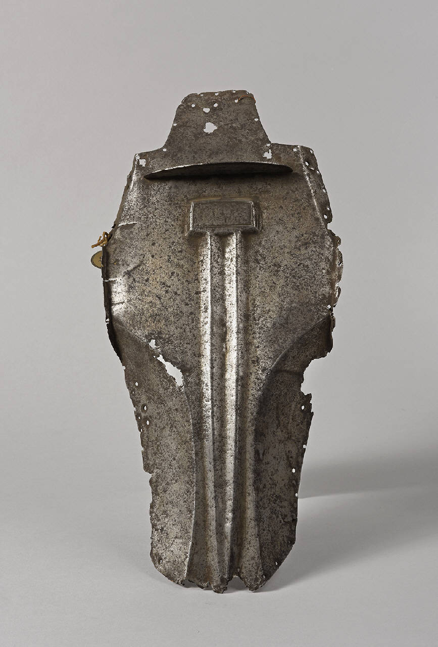 Testiera per cavallo. Testiera a vista brunita con frontale a due scanalature longitudinali che si dipartono da un rialzo rettangolare sotto il frontale.