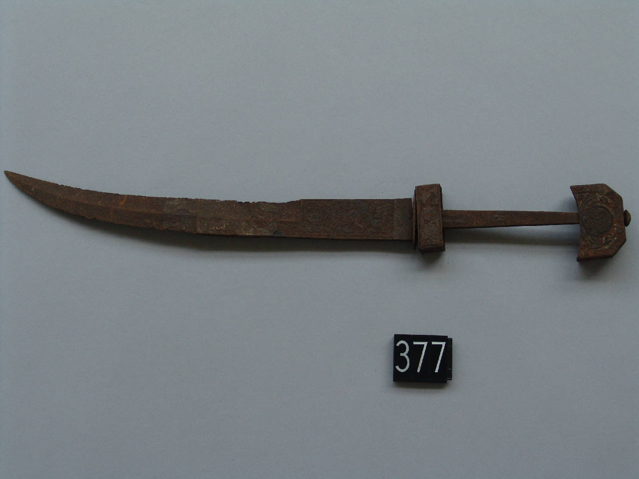 Koumaya, coltello ricurvo con doppio filo che scorre dal medio al debole. Sul forte, da un lato, si trova l'iscrizione "artilleria fabrica de toledo" entro medaglione circolare. Sull'altro lato, iscrizioni arabe. Lama bruciata e arrugginita. Dell'impugnatura resta il pomolo squadrato in metallo inciso.