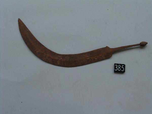Coltello a falce con lama crestata a doppio filo e codolo a spuntone terminante a pomolo sfaccettato.