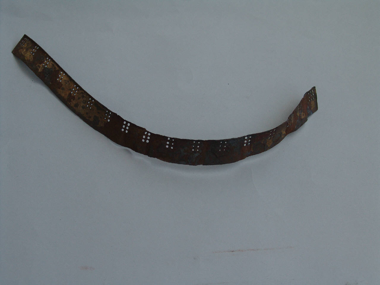 Parte di armatura? Fettuccia metallica sagomata a falce e curvata, con fori passanti sui bordi.