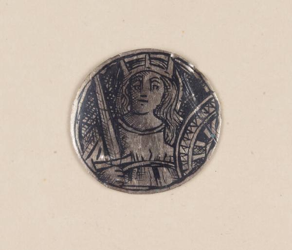 - NOTIZIE STORICO CRITICHE Il niello, conservato su un vassoio insieme ad altri pezzi (e contrassegnato dal n. 21), è inserito dal Malaspina nel suo Catalogo del 1824 tra quelli "de' bassi tempi", perlopiù di forma tonda e di soggetto sacro, che andavano originariamente a decorare oreficerie liturgiche. La santa raffigurata è indicata da Malaspina come Sant'Elena, ma gli attributi potrebbero suggerire che si tratti di Santa Caterina. Per analogie stilistiche si vedano anche i nielli inv. St. Mal. 5404, 5408, 5418.