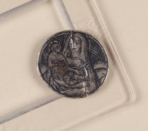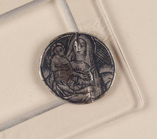 - NOTIZIE STORICO CRITICHE Il niello, conservato su un vassoio insieme ad altri pezzi e contrassegnato su di esso dal n. 36, è inserito dal Malaspina nel suo Catalogo del 1824 tra quelli "de' bassi tempi", perlopiù di forma tonda e di soggetto sacro, che andavano originariamente a decorare oreficerie liturgiche. Secondo quanto riportato in Duchesne (1826), un'impressione su carta da questa lastrina si trovava nella collezione Woodburn. Stilisticamente, il niello ci pare assimilabile ad altri tre conservati nella stessa raccolta (cfr. inv. St. Mal. 5389, 5408, 5418).