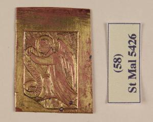 - NOTIZIE STORICO CRITICHE Questa lastrina, di forma irregolare, fa parte di un gruppo di quattro analoghe (si vedano le schede relative, inv. St. Mal. 5424-5427), in ottone inciso, conservate su un vassoio insieme ad altri pezzi niellati (la lastra schedata è contrassegnata, sul vassoio, dal n. 58), pur risultando esse prive di nigellum. E' comunque descritta dal Malaspina nel suo Catalogo del 1824 insieme ai nielli 'de' bassi tempi', come se si trattasse di uno stadio anteriore alla niellatura. E' probabile che si tratti di un esemplare di fattura ottocentesca, magari non italiana. Il soggetto raffigurato è l'Angelo annunciante, e fa pendant con l'altra lastra su cui si riconosce la Madonna annunciata. Da questa, come dalle altre tre lastrine, sono state tirate prove su carta: si veda l'esemplare nella collezione Malaspina, inv. St. Mal. 1500. Dalla forma delle quattro lastrine (con un angolo tagliato, due in uno di quelli in basso, due in uno di quelli in alto), si potrebbe pensare che la disposizione fosse intorno ad un qualche altro soggetto posto centralmente.