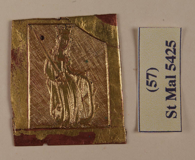 - NOTIZIE STORICO CRITICHE Questa lastrina, di forma irregolare, fa parte di un gruppo di quattro analoghe (si vedano le schede relative, inv. St. Mal. 5424-5427), in ottone inciso, conservate su un vassoio insieme ad altri pezzi niellati (la lastra schedata è contrassegnata, sul vassoio, dal n. 57), pur risultando esse prive di nigellum. E' comunque descritta dal Malaspina nel suo Catalogo del 1824 insieme ai nielli 'de' bassi tempi', come se si trattasse di uno stadio anteriore alla niellatura. E' probabile che si tratti di un esemplare di fattura ottocentesca, magari non italiana. Da questa, come dalle altre tre lastrine, sono state tirate prove su carta: si veda l'esemplare nella collezione Malaspina, inv. St. Mal. 1498. Dalla forma delle quattro lastrine (con un angolo tagliato, due in uno di quelli in basso, due in uno di quelli in alto), si potrebbe pensare che la disposizione fosse intorno ad un qualche altro soggetto posto centralmente. Questa lastra in particolare sembra mostrare, al di sopra della parte incisa, un pezzo di un'altra composizione.