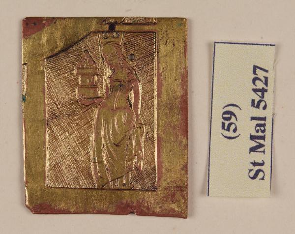 - NOTIZIE STORICO CRITICHE Questa lastrina, di forma irregolare, fa parte di un gruppo di quattro analoghe (si vedano le schede relative, inv. St. Mal. 5424-5427), in ottone inciso, conservate su un vassoio insieme ad altri pezzi niellati (la lastra schedata è contrassegnata, sul vassoio, dal n. 59), pur risultando esse prive di nigellum. E' comunque descritta dal Malaspina nel suo Catalogo del 1824 insieme ai nielli 'de' bassi tempi', come se si trattasse di uno stadio anteriore alla niellatura. E' probabile che si tratti di un esemplare di fattura ottocentesca, magari non italiana. Da questa, come dalle altre tre lastrine, sono state tirate prove su carta: si veda l'esemplare nella collezione Malaspina, inv. St. Mal. 1497. Dalla forma delle quattro lastrine (con un angolo tagliato, due in uno di quelli in basso, due in uno di quelli in alto), si potrebbe pensare che la disposizione fosse intorno ad un qualche altro soggetto posto centralmente.