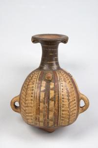 Miniatura di anfora con base instabile, camera globulare a base convesso-conica e versatoio cilindrico, svasato con colletto espanso e appiattito con due orecchiette simmetriche sotto il bordo. Lateralmente due anse simmetriche, e infine un appiglio per la sospensione sulle spalle del recipiente mediante corde. Decorato in policromia (rosso e marrone scuro) su fondo crema con motivi geometrici e a "selce".