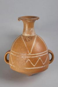 Anfora in terracotta con camera globulare, base convesso conica, superiormente un versatoio cilindrico, svasato, con due minuscole orecchiette simmetriche sotto il bordo, lateralmente due anse simmetriche, appiglio zoomorfo sulle spalle della camera. Decorazione geometrica di colore bianco su sfondo arancio.