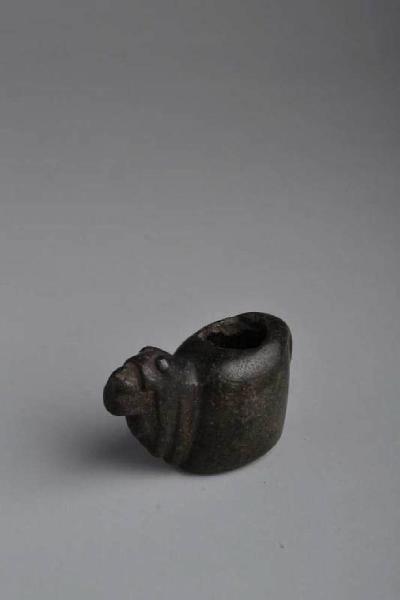 Miniatura o conopa in basalto nero raffigurante un alpaca. Sul reperto si notano tracce di lavorazione con sega a corda e con trapano-sega montato su supporto. Foro sul dorso malamente rifinito o danneggiato successivamente da colpi verticali.