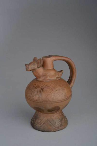 Bottiglia con camera globulare, base tronco - conica cava, superiormente un piccolo quadrupede sul quale poggia il versatoio quasi totalmente mancante, lateralmente un manico nastriforme. Impasto di colore mattone, ingobbio color crema. La bottiglia, decorata in bicromia (caffè e crema) presenta sulle spalle della camera sei quadranti con decorazioni geometriche e otto cerchi sul ventre. La base della bottiglia è decorata a stampaggio con motivi triangolari a gradoni.