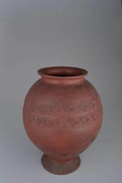Anfora con camera globulare, base tronco - conica svasata cava, larga apertura superiore con colletto everso. Impasto grossolano color mattone con sgrassante grossolano bianco e nero. Ingobbio fine color mattone. L' anfora, il cui asse è inclinato di circa 10° rispetto alla verticale, è decorata a stampo con due bande dorsali che presentano un motivo a foglia.\n