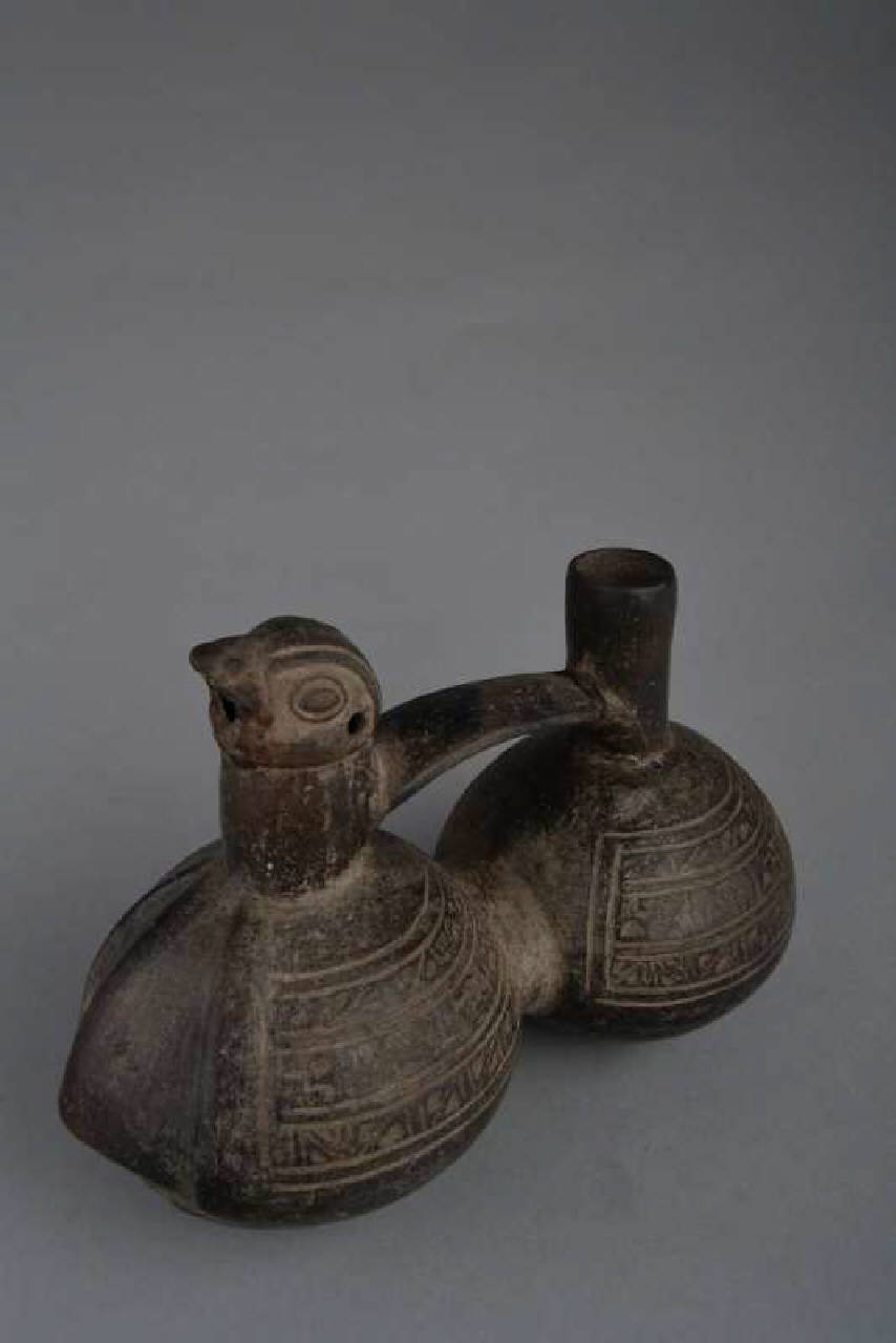 Bottiglia zoomorfa doppia fischiante con due camere globulari a base piana circolare, raccordo ventrale, superiormente due versatoi cilindrici di cui uno, più corto, chiuso da una testa d' uccello: questa ha due fori laterali ed uno sotto il becco fratturato che, all' uscita dell'aria interna, emettono un suono simile ad un cinguettino; tra i versatoi un manico a ponte nastriforme. Impasto fine di colore nero, ingobbio dello stesso colore. Cottura riducente. Le camere del vaso sono decorate a stampo con motivi geometrici (triangoli doppi, gradoni che ricordano ornamentazioni tessili della sierra); quella con versatoio a testa d' uccello raffigura molto probabilmente un pappagallo.