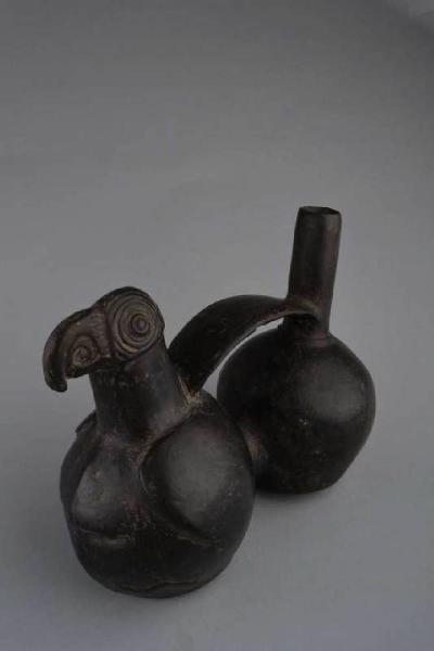 Bottiglia zoomorfa con due camere globulari a base piana circolare, raccordo ventrale, superiormente un versatoio cilindrico ed una testa di uccello (pappagallo) uniti da un manico a ponte nastriforme. Impasto di colore grigio, ingobbio di colore nero. Cottura riducente.
