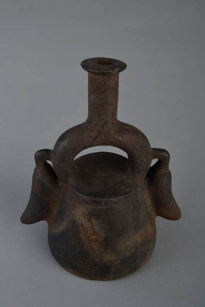 Bottiglia con camera tronco - conica, base piana circolare; ai lati della camera due peperoni, superiormente un' ansa a staffa a sezione circolare con versatoio cilindrico dal colletto ad anello piatto. Impasto di colore grigio chiaro, ingobbio grigio e nero con macchie rosse per difetto di cottura. Cottura riducente. Esecuzione a stampo verticale.