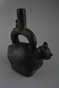 Bottiglia zoomorfa con camera zoomorfa, base piana rettangolare, superiormente un' ansa a staffa a sezione rettangolare e un versatoio cilindrico. Impasto di colore grigio, ingobbio di colore nero. Cottura riducente. Esecuzione a stampo verticale. La bottiglia rappresenta un felino (puma) con la testa a tutto tondo, gli organi sessuali maschili in bassorilievo e le zampe appena accennate sulla camera. Tra l'ansa e il versatoio è applicata una scimmietta.