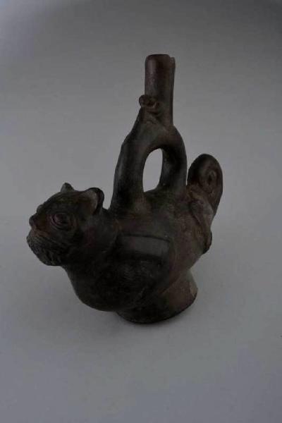 Bottiglia zoomorfa con camera a forma di otaria, base cilindrica piana iregolare, superiormente un 'ansa a staffa a sezione circolare con un versatoio cilindrico. Impasto fine di colore grigio, ingobbio di colore nero. Cottura riducente. Esecuzione a stampo verticale. La camera del vaso raffigura un'otaria che tiene qualcosa in bocca, forse una pietruzza, e digrigna i denti, la coda è avvolta a spirale le zampe sono in posizione natatoria. Sull' ansa è applicata una scimmietta aggrappata al versatoio con le zampe anteriori.