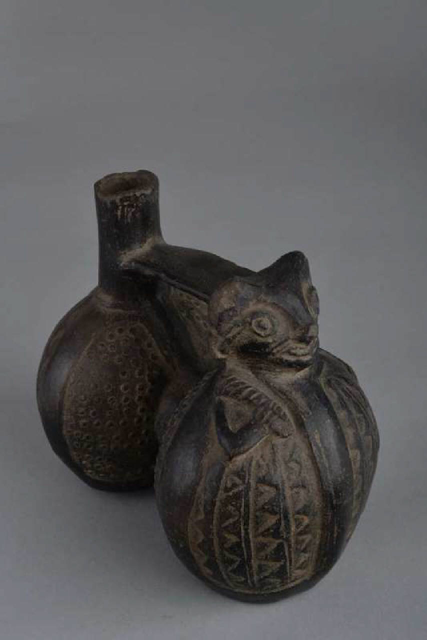 Bottiglia zoomorfa con due camere a forma di fiasca a base piana ellittica, raccordo ventrale; superiormente versatoio cilindrico ed una testa antropomorfa uniti da un manico a ponte nastriforme. Impasto di colore grigio, ingobbio di colore nero. Cottura riducente. Esecuzione a stampo verticale. La camera con latesta antropo - zoomorfa rappresenta un personaggio con maschera (o con aspetto da felino) che impugna uno strombus a mò di tromba resa in appliquè e che indossa una tunica decorata a stampaggio con motivi dentellati anteriormente e a pelle d' oca posteriormente. La stessa decorazione si trova anche sull' altra camera munita invece di versatoio.