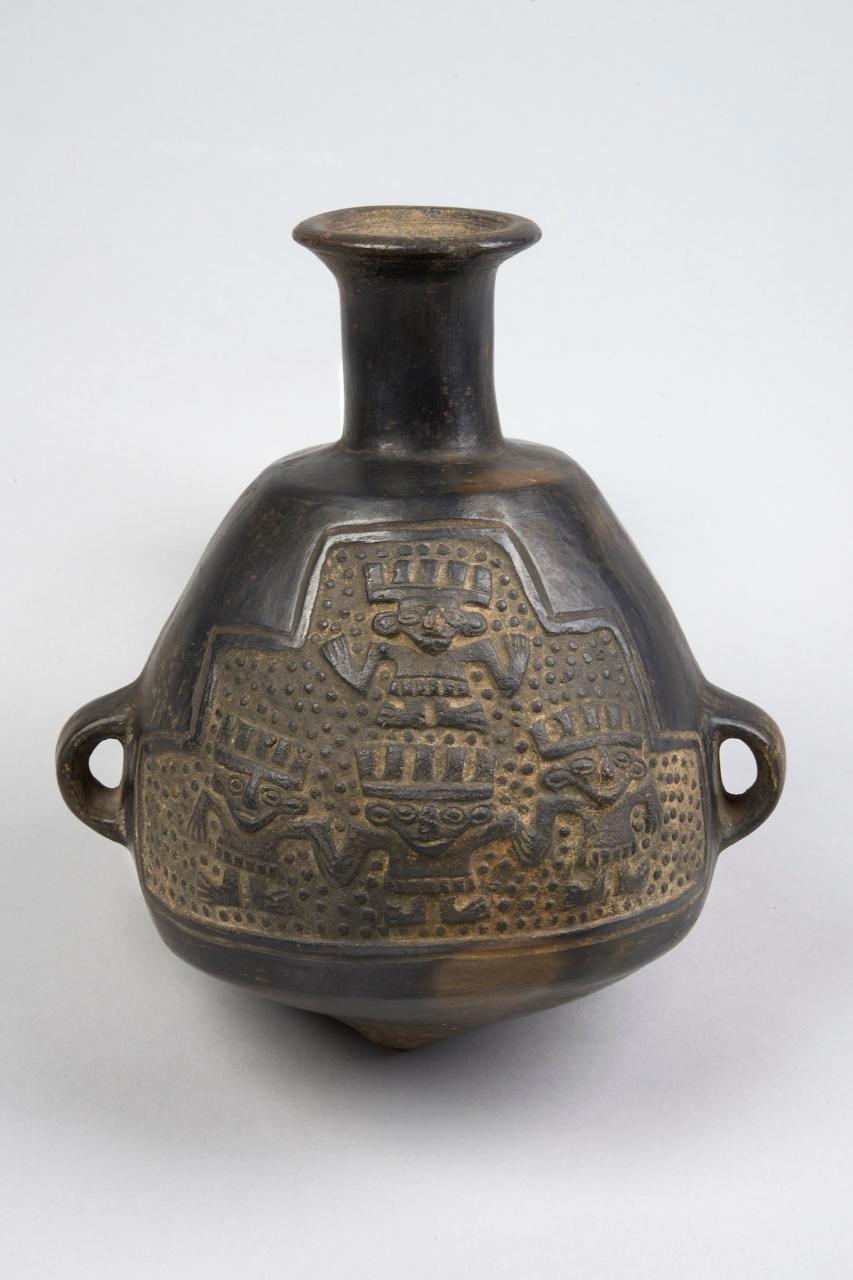 - NOTIZIE STORICO CRITICHE La forma assomglia a quella dei recipienti tipici della cultura inca, gli aryballos, mentre la tipologia dell'impasto, la cottura e il decoro frontale exciso che rappresenta dei personaggi con le braccia alzate, sono tipici della tradizione ceramica chimú.