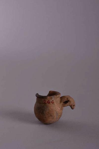 Anforetta con camera globulare, base convessa, superiormente piccolo collo leggermente rastremato con labbro, lateralmente manico cavo forse raffigurante un tapiro. Impasto fine di colore crema con sgrassante nero. Ingobbio fine color crema. Cottura ossidante con "nubi". Esecuzione a falso tornio, manico assemblato.