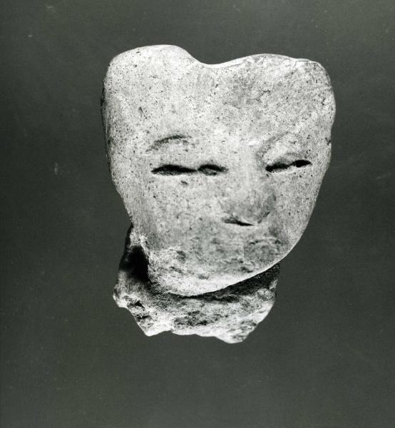 Testina di figurina fittile. Il viso è ovale, presenta deformazione cranica intenzionale bilobata, non presenta capelli. Gli occhi sono fessurati con resti di sopracciglia incise e resti di pupilla in rilievo.Il naso è quasi del tutto eroso, è dritto e vi sono tracce delle narici.La bocca è grande, con labbra sottili in rilievo e collocata in modo asimmetrico nel volto. Il collo è massiccio e frammentato. \nImpasto: 5 YR PINKISH WHITE 8/2