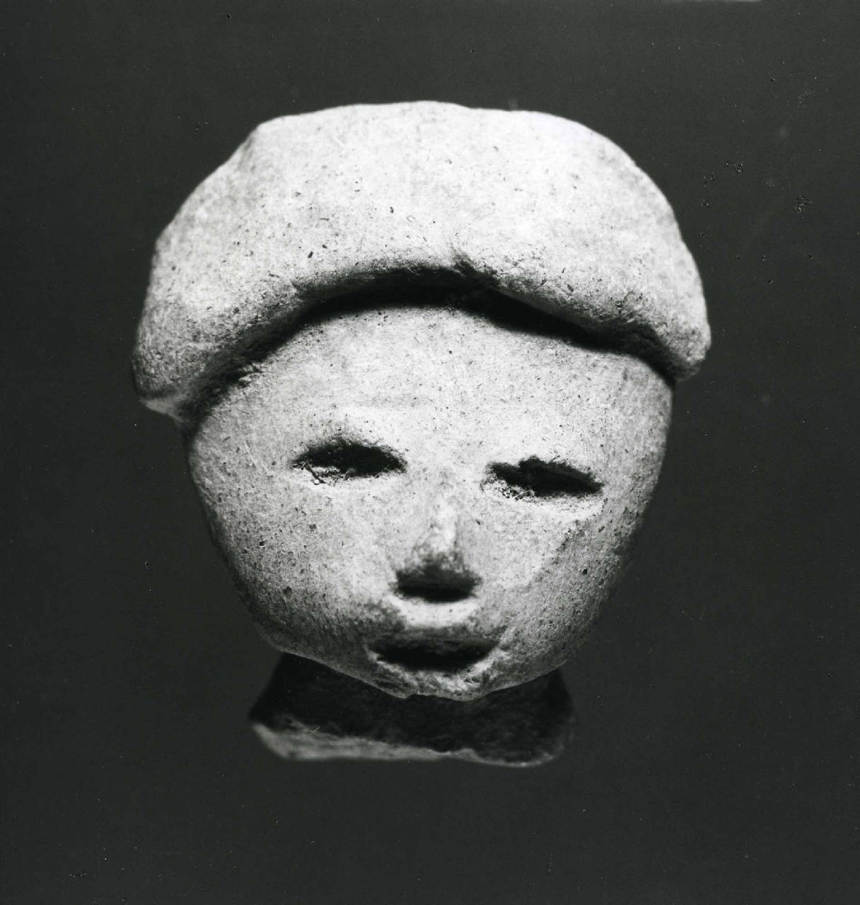 Testina di figurina fittile, con volto leggermente prognato, con occhi fessurati, (mediante profonde excisioni), bocca aperta e copricapo a turbante . Impasto fine di colore ocra chiaro - mattone chiaro (x 9 - 10, y 12 - 13). Ingobbio evanescente. Cottura ossidante.