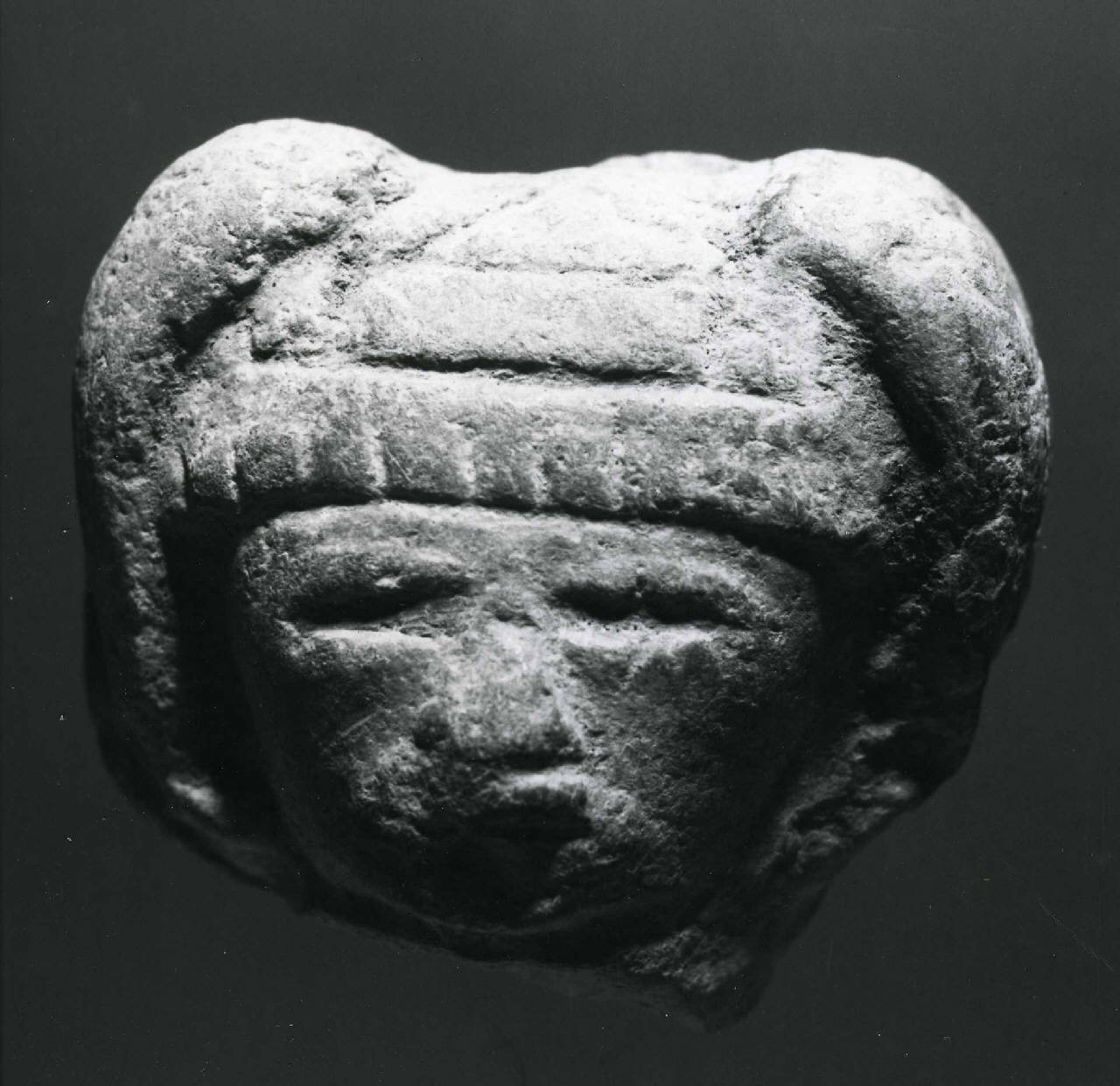 Testina di figurina fittile con occhi fessurati e palpebre in rilevo, grande naso e copricapo con nappe (o ciocche di capelli ?) laterali. Impasto fine di colore ocra (x 9 - 10, y 8 - 9). Ingobbio evanescente. Cottura ossidante.