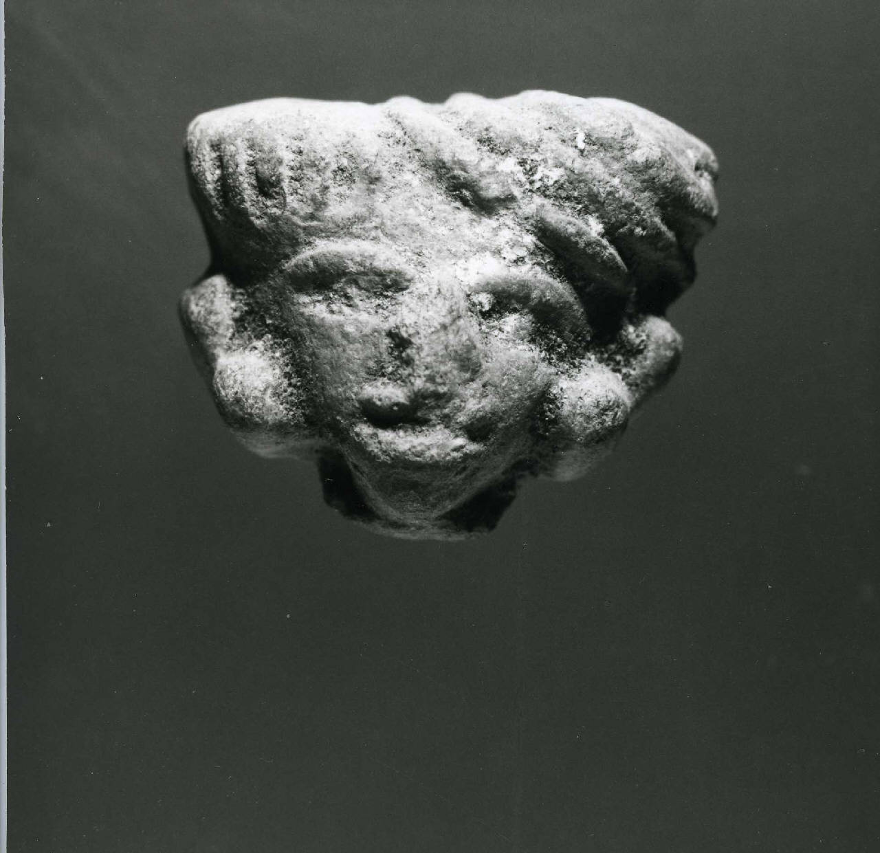 Testina di figurina fittile con viso triangolare dalla fronte inesistente e dal mento appuntito. Gli occhi son grandi, con palpebre in rilievo. Presenta pupilla in rilievo mentre il resto dell¿occhio è reso mediante incisione. Il naso è piccolo, quasi del tutto eroso. La bocca presenta labbra in rilievo delle quali l¿inferiore è carnoso. Il collo è quasi inesistente, a sezione circolare. La figurina porta orecchini discoidali, sono anche visibili le orecchie. Il copricapo è formato da due parti distinte: quella di sinistra presenta corte penne; quella di destra è caratterizzata da un turbante a spirale che si articola in diagonale. E¿ visibile la presenza di tracce di colore bianco. Impasto: 2.5 YR LIGHT RED 6/8.