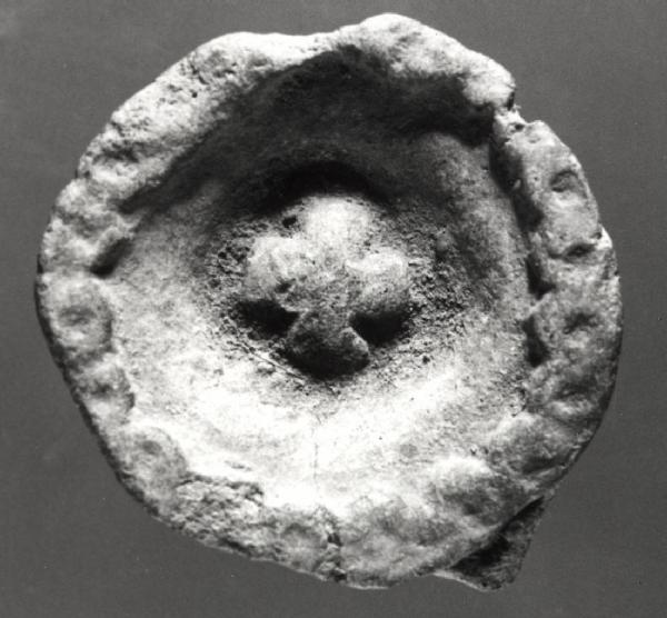 Ornamento in terracotta di forma emisferica. Al centro dell'oggetto si osserva un motivo cruciforme. Nel suo complesso l'ornamento potrebbe raffigurare un fiore. Impasto medio - fine di colore ocra chiaro (x 8 - 9, y 9 - 10). Ingobbio evanescente. Cottura ossidante.
