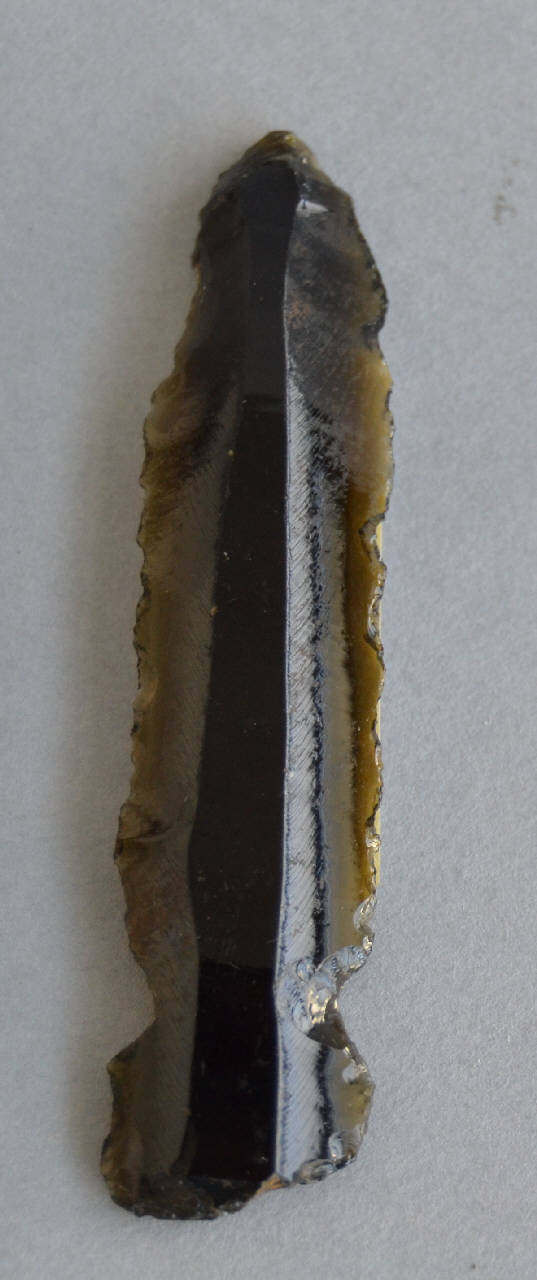 Lama prismatica in ossidiana verde. Alla base sono state create due tacche laterali a formare un peduncolo tale da permettere l'inserimento della lama in un elemento d'immanicatura. Il ritocco è scagliato, marginale, diretto, lineare e continuo sui margini laterali, prossimale e distale.