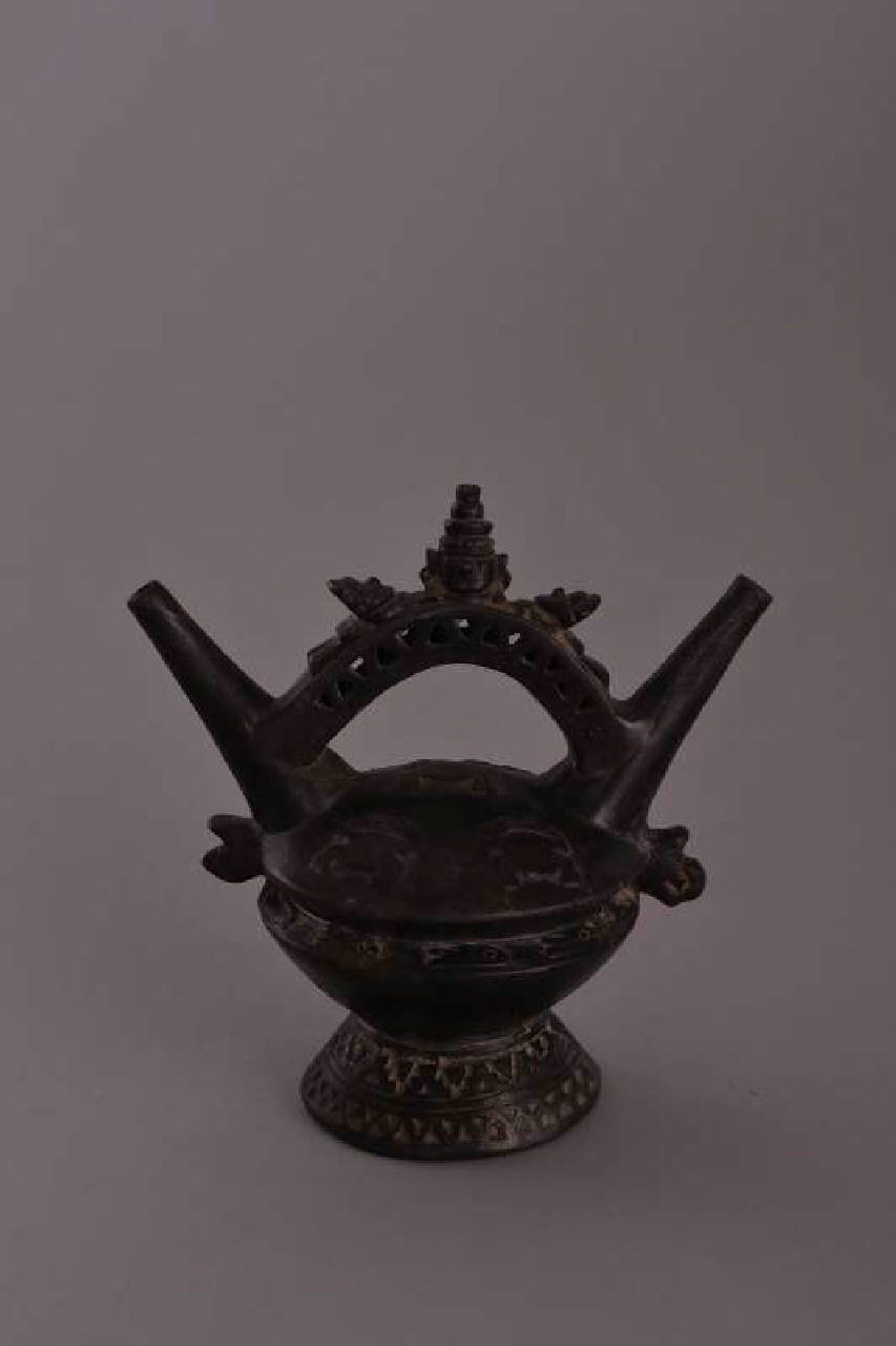 Bottiglia in terracotta con camera lenticolare, base tronco-conico cava, superiormente due beccucci tronco-conici, che formano tra loro un angolo di 80°, uniti da un manico a ponte cavo a sezione rettangolare. Sulla parte sommitale del ponte è raffigurata la testa della divinità fondatrice della dinastia Sicán, Llampallec, fiancheggiata da due "natanti", spesso interpretati come i nuotatori che, nel racconto mitico che spiega come la divinità sia arrivata nella costa nord del Perù dal mare, spinsero la barca del dio fatta di canne di totora fino alla riva. Decorazione con granchi nella parte superiore della camera e protomi laterali. Delle due protomi ai lati del corpo, una è ben definita e un'altra appena accennata.