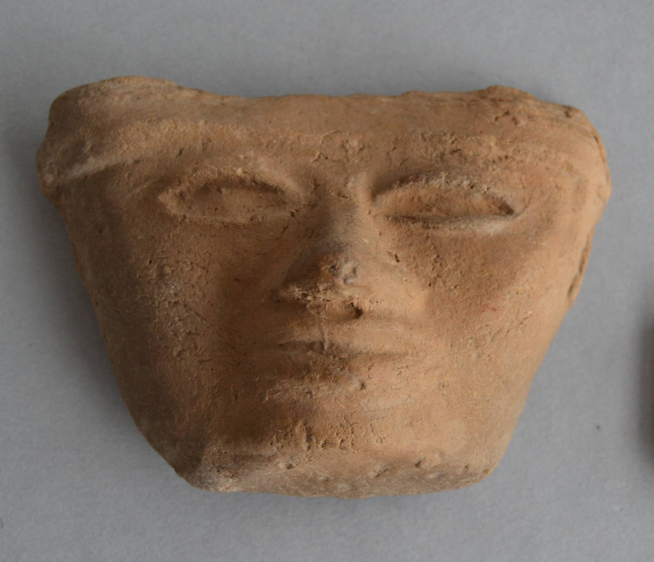 Applicazione fittile di incensiere-teatro in forma di volto umano, con occhi ellittici e banda frontale.