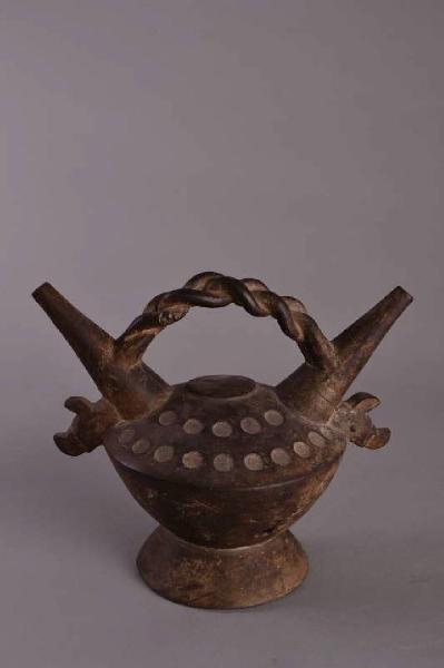 Bottiglia a doppio versatoio con manico a ponte a treccia.Sulle spalle una decorazione a circoli impressi. Ai lati due terminali a forma di testa di serpente (?).