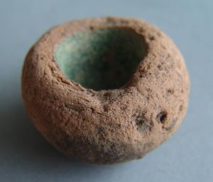 Vasetto miniatura fittile di forma globulare. Al suo interno le pareti sono dipinte di verde con un colore che appare coloniale o moderno.