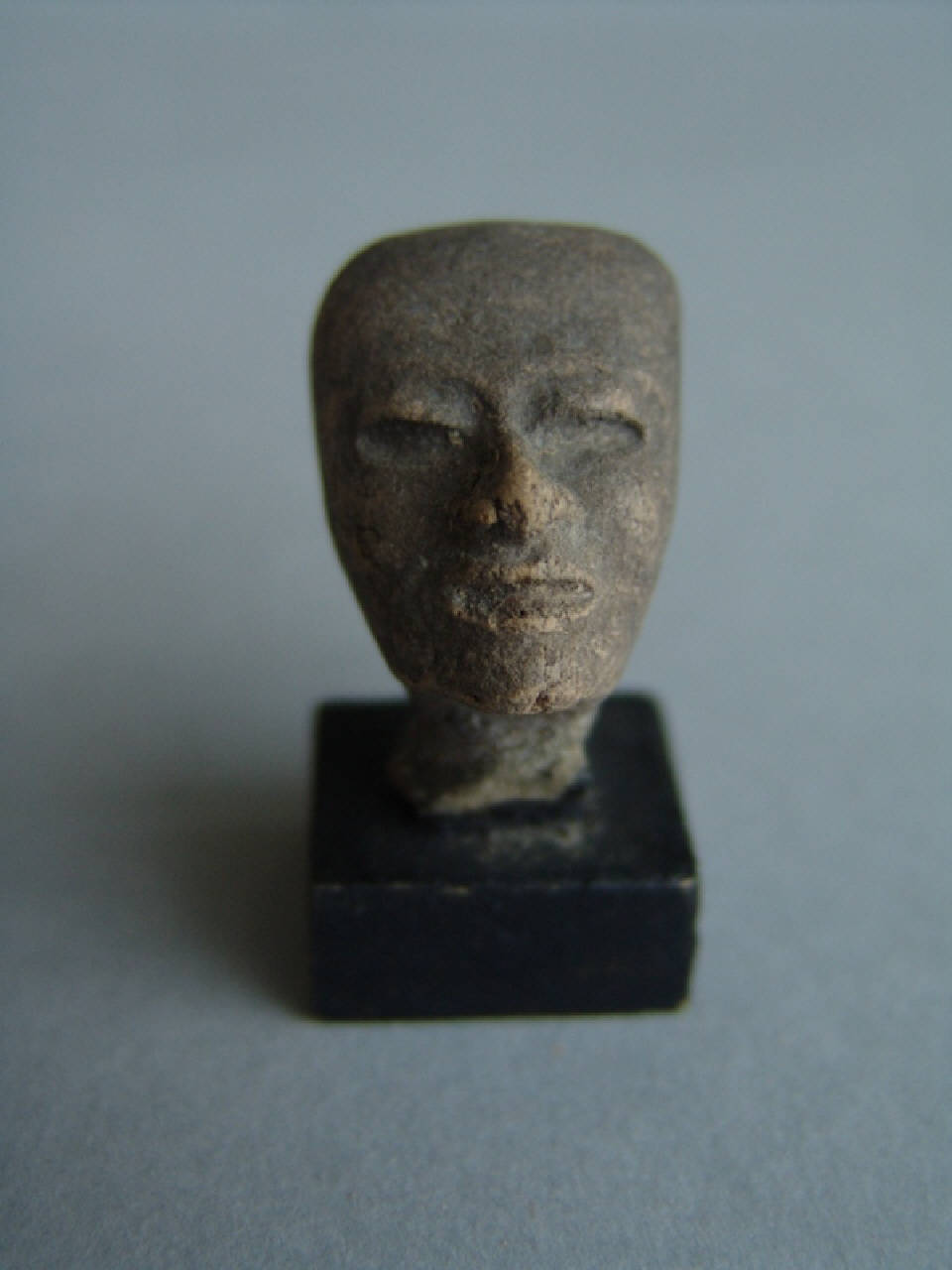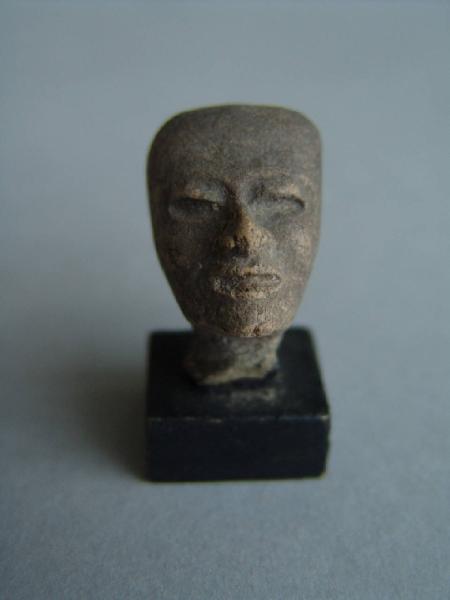 Testina di figurina fittile con individuo dal volto subtriangolare, con deformazione cranica, naso prominente, occhi ellittici e bocca semiaperta.