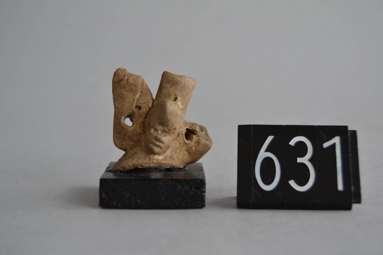 Frammento di fischietto fittile antropomorfo. Sull'imboccatura, fiancheggiata da due "ali" perforate che fungevano da impugnatura e da punto di sospensione, è applicata una testina dal viso ovale. Gli occhi sono fessurati. Il naso è piccolo. La bocca è fessurata. Il copricapo è conico e sporgente. Impasto: 7.5 YR LIGHT BROWN 6/3