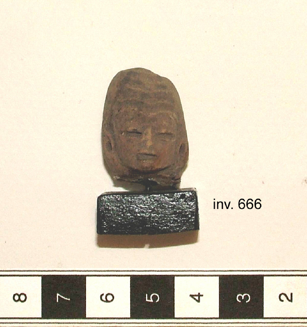 Testina di figurina fittile antropomorfa. Il viso è ovale. Gli occhi sono fessurati mediante incisione.Iil naso è piccolo e dritto. La bocca è fessurata con labbra in rilievo. Il copricapo è di forma conica, è costituito da cinque fasce di V molto aperta; sui lati s'intravedono due fasce che ricadono ai lati del viso. La figurina porta orecchini ad anello resi tramite punzonatura: 2,5 YR DARK REDDISH GRAY 4/1; Ingobbio: 10 YR PINK 8/3.