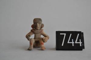 Figurina fittile antropomorfa. Il capo mostra deformazione cranica tabulare eretta, non presenta capelli. Gli occhi sono a mandorla, fessurati, con le sopracciglia ben disegnate. Il naso è ben delineato e dritto con le narici larghe. La bocca è socchiusa con le labbra evidenti. La figurina è seduta con le gambe e le braccia semiflesse, gli arti sono formati da dei rotoli d¿argilla e presentano tracce di pigmento rosso il quale diventa evidente sia sulle caviglie che sui polsi, in questi luoghi sembra disegnare dei bracciali. Mani e piedi hanno disegnate, mediante incisioni lineari, cinque dita, le mani sono modellate realisticamente stanno nell¿atto di tenere qualcosa. La figurina porta orecchini discoidali dipinti di rosso, ha anche due collane rese con due rotoli di argilla sovrapposti dipinti anch¿essi di rosso. La figurina porta in vita una cintura come quelle usate per il gioco della palla, anch¿essa è realizzata mediante un rotolo d¿argilla. Impasto: 2,5 YR LIGHT RED 6/6 Ingobbio: 2.5 YR DARK REDDISH GRAY 3/1 Cottura: Ossidante.