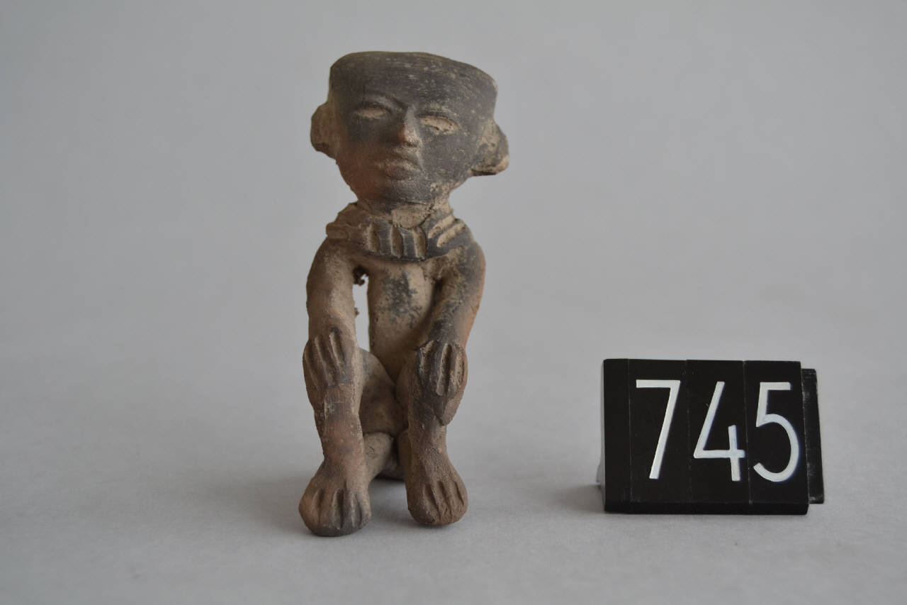 Figurina fittile antropomorfa. Il volto della figurina è di forma ovale e presenta una deformazione cranica intenzionale tabulare eretta. Ha occhi fessurati, con palpebre in rilievo; sono visibili le sopracciglia appena accennate le quali si uniscono sopra il naso. Il naso è dritto, con narici piccole. La figurina presenta la bocca semiaperta, con labbra in rilievo le labbra sono piegate verso il basso. La figurina presenta un collo largo e corto, taurino. La figurina è un nudo lavorato a tutto tondo; il corpo è schematico con busto lungo, braccia e gambe formate da rotoli di terracotta. Gli arti sono stati aggiunti in appliquè. La figurina è ritratta in posizione seduta con le ginocchia piegate con la gamba destra più in dietro della sinistra; le mani sono appoggiate alle ginocchia. Le dita delle mani e dei piedi sono rese grazie a delle incisioni. Alla base della figurina sono presenti due rotoli di terracotta che uniscono la base di essa ai piedi, probabilmente fungono da contrappeso in quanto la testa è notevolmente inclinata indietro. La figurina presenta orecchini discoidali, un collare reso attraverso due profonde incisioni.