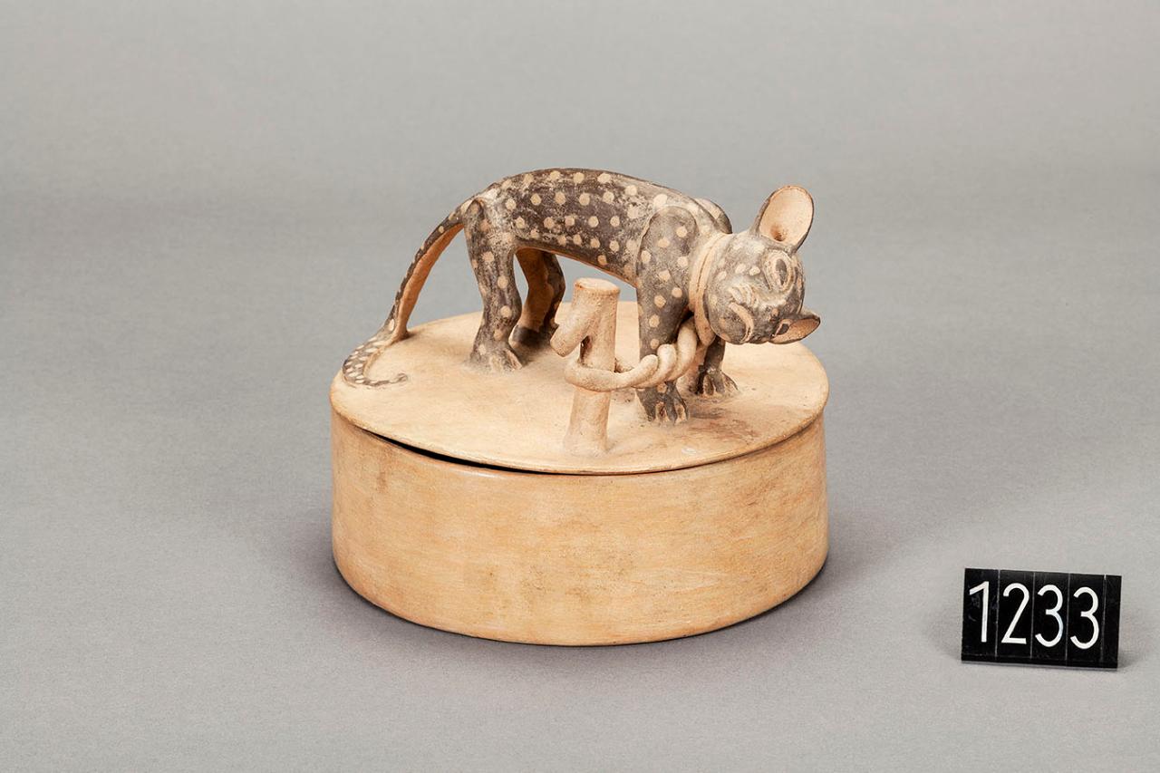Ciotola in terracotta bianca sul cui coperchio è raffigurato un felino legato ad un palo, in cattività. Quest'opera, che ha pochi confronti, mostra un animale esotico per l'habitat della costa peruviana, forse portato dalla zona della selva come bene di prestigio.