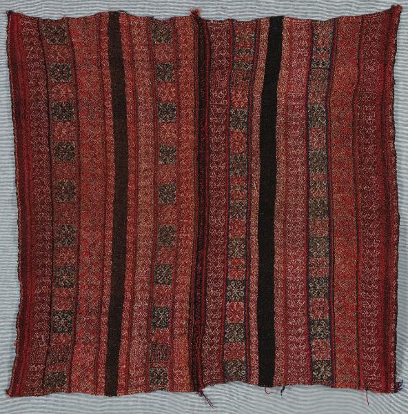 Manta ad uso cerimoniale (matrimonio) composta da due pezze tessute su telaio a cintura ed unite con fili di lana; ogni pezza presenta un disegno a otto righe policrome con motivi geometrici, una riga nera e una riga sui toni del rosso. Trame monocrome marroni, orditi policromi.