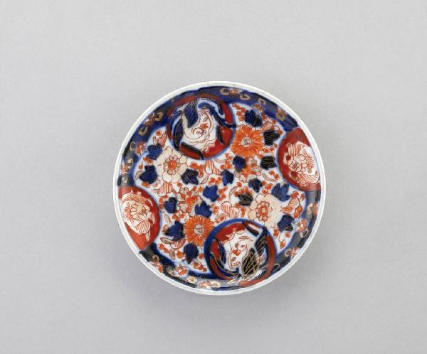 Piattino circolare in porcellana dipinta a smalto blu di cobalto sotto l'invetriatura trasparente, con decorazione floreale e due riserve circolari con uccello stilizzato.