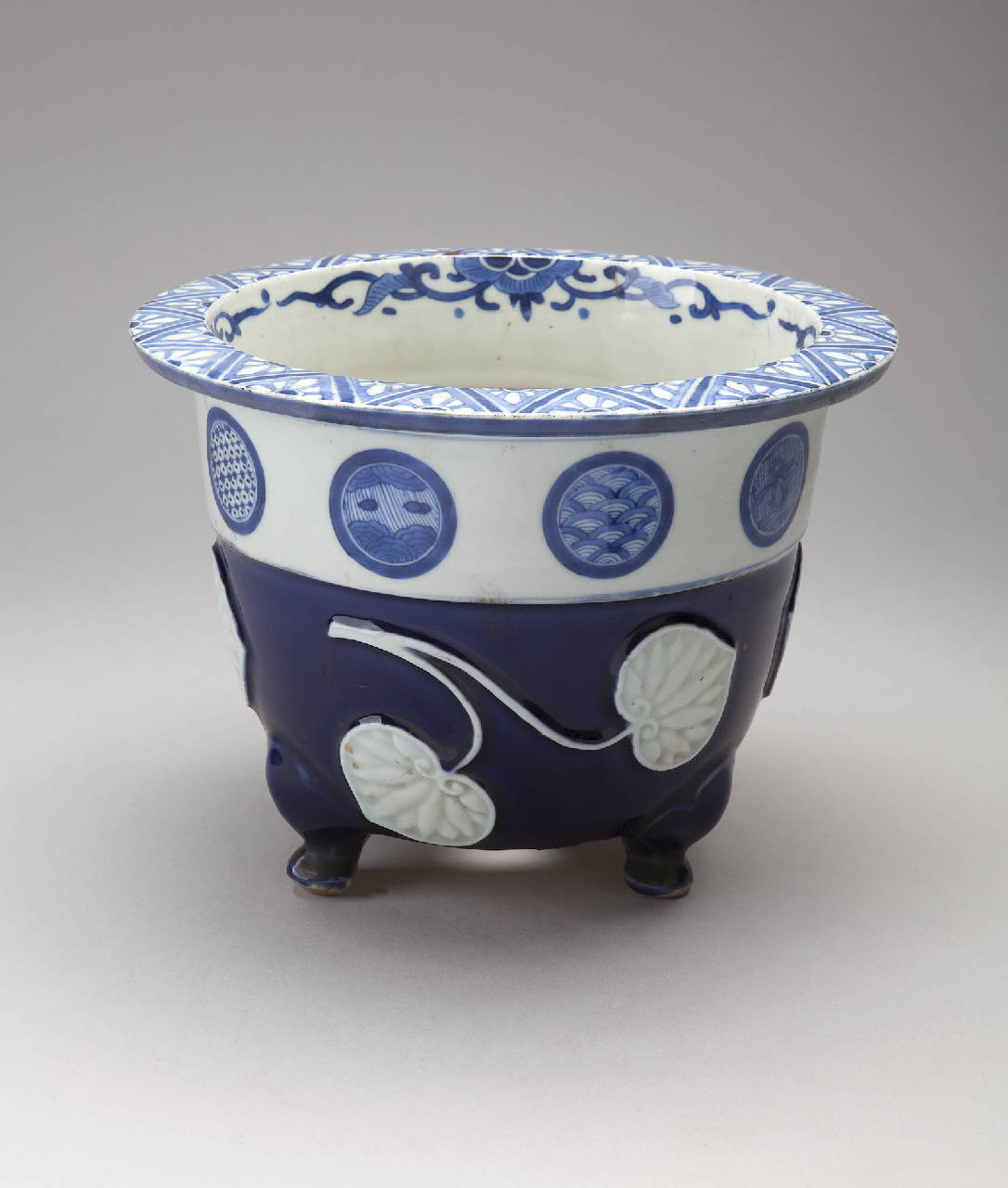 Vaso da giardino (yoki) in porcellana lavorata a rilievo e dipinta a smalto blu. A sezione circolare, posa su tre piedini e ha tesa piatta. Nella zona inferiore della parete esterna, decoro in rilievo di foglie; in quella superiore, fascia con medaglioni circolari con decori floreali e geometrici; sulla tesa ornato geometrico.