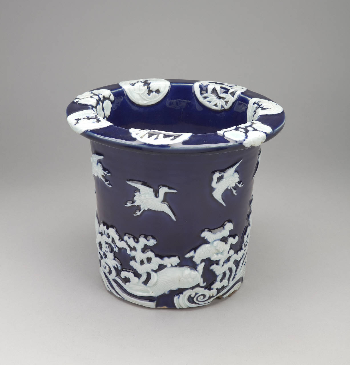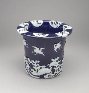 Vaso da giardino (yoki) in porcellana lavorata a rilievo e dipinta a smalto blu. Ha sezione circolare e tesa piatta. La decorazione sull'esterno, realizzata a rilievo in bianco sul blu di fondo, consiste in una scena con tartarughe (minogame) e gru (tsuru), entrambi simbolo di longevità, con onde marine (nami).