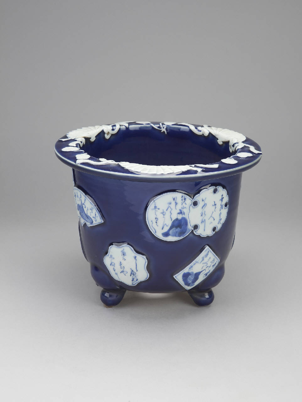 Vaso da giardino (yoki) in porcellana lavorata a rilievo e dipinta a smalto blu. Ha corpo a sezione circolare, posa su tre piedini e ha larga tesa piatta. La decorazione sull'esterno del corpo consiste in una serie di cartigli di varie forme, all'interno di ognuno dei quali il ritratto idealizzato di un poeta con poesia, oppure solo poesia.