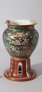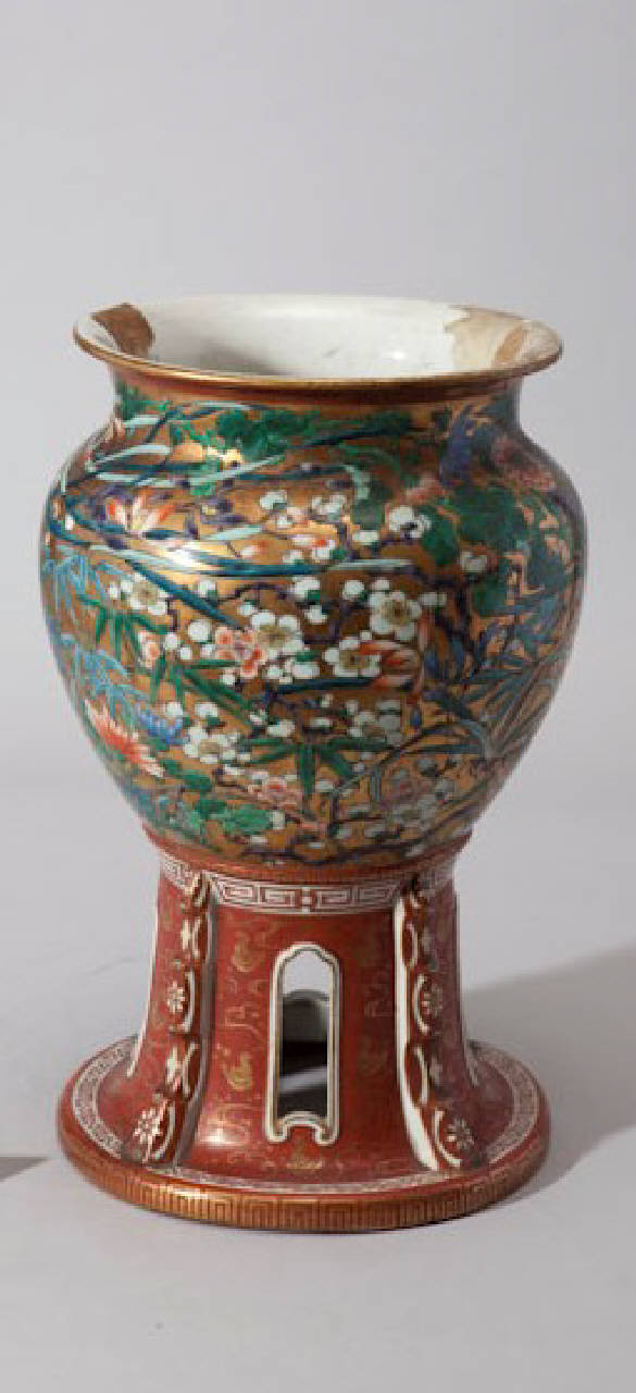 Vaso in porcellana dipinta a smalti policromi con diffuse stesure dorate. Ha corpo globulare posante su alto piedistallo con grandi aperture, collo cilindrico e orlo della bocca svasato. L'esuberante decorazione si compone di tappeti floreali e inserti geometrici.