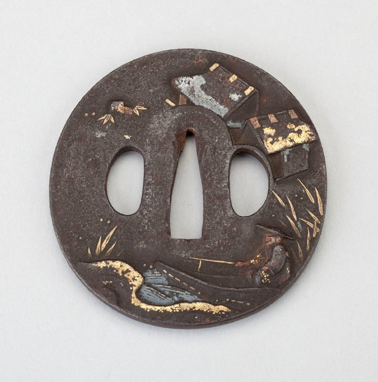 Elsa (tsuba) in ferro di forma all'incirca circolare. Superficie leggermente granulosa (ishimeji), lavorazione ad alto rilievo (takabori) e applicazioni in oro, argento e rame (iroe zogan) con dettagli in agemina d'oro e argento (nunome zogan). Il decoro consiste in una scena con uno scorcio di paesaggio con due case, piante e un pescatore su barchetta.