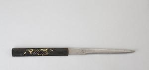 Coltellino (kogatana) con lama in acciaio e impugnatura (kozuka) in lega metallica shakudo. Il manico ha superficie lavorata a bulino con puntinatura regolare (nanako), decorata con arco e spallaccio (sode) in agemina d'oro ad alto rilievo (takazogan) e incisioni (takanikubori).