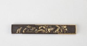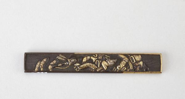 Impugnatura (kozuka) di coltellino (kogatana) in lega metallica shakudo. Superficie lavorata a bulino con puntinatura regolare (nanako), decorata con scena con l'imperatrice Jingo kogo e il ministro Takeshiuchi no sukune che tiene in braccio Homura, il figlio dell'imperatrice e futuro imperatore, in agemina d'oro e altri metalli in alto rilievo (iroe takazogan).