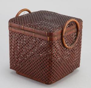 Cestino in vimine intrecciato a sezione rettangolare. Ha coperchio e manici circolari.