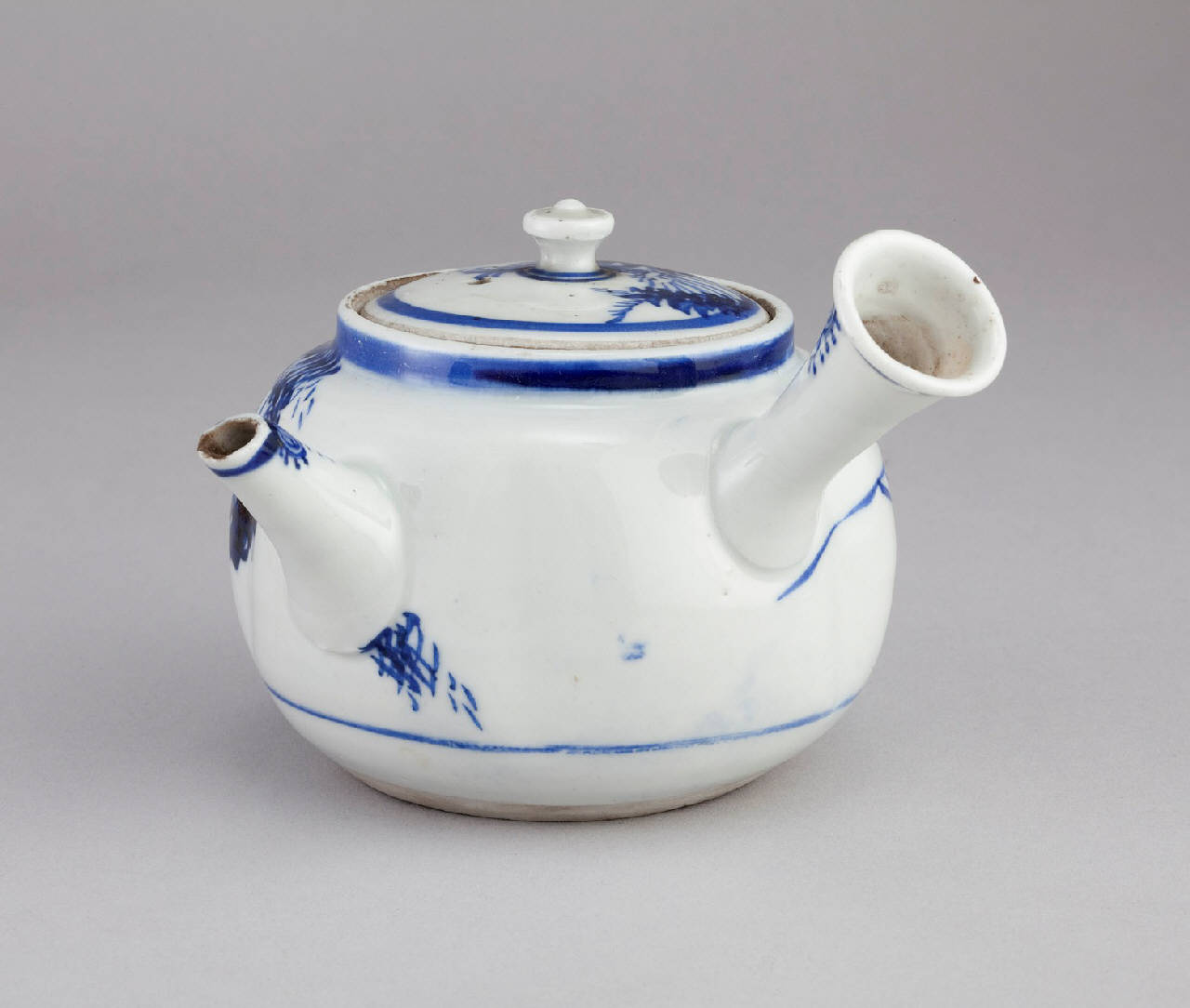 Piccola teiera in porcellana 'bianco blu' con coperchio. Pancia sferica con cinque leggere concavità, beccuccio troncoconico e presa conica in posizione laterale rispetto al beccuccio. Decorazione in blu sottocoperta a motivi fitomorfi abbozzati.